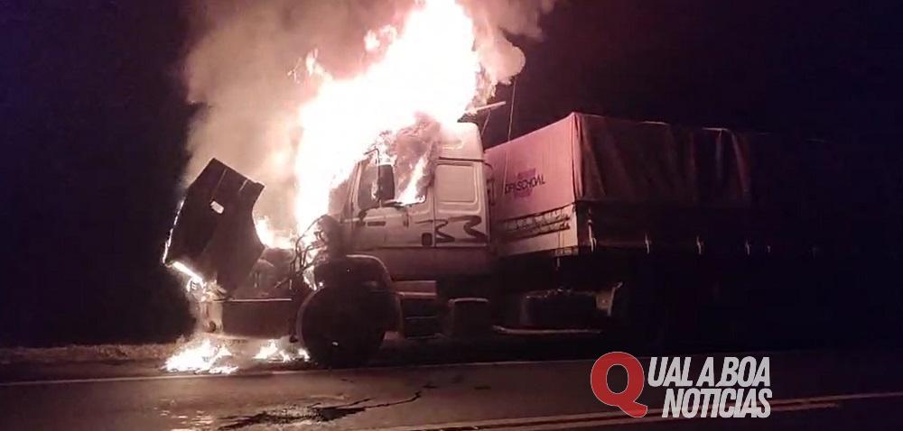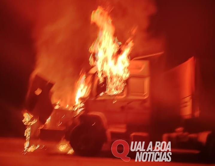 Uma carreta com placas de Nova Santa Rosa foi totalmente destruída por um incêndio na noite da última segunda-feira (7), na BR-277, nas proximidades do km 402 da rodovia, entre os municípios de Candói e Cantagalo, próximo ao posto Três Pinheiros.