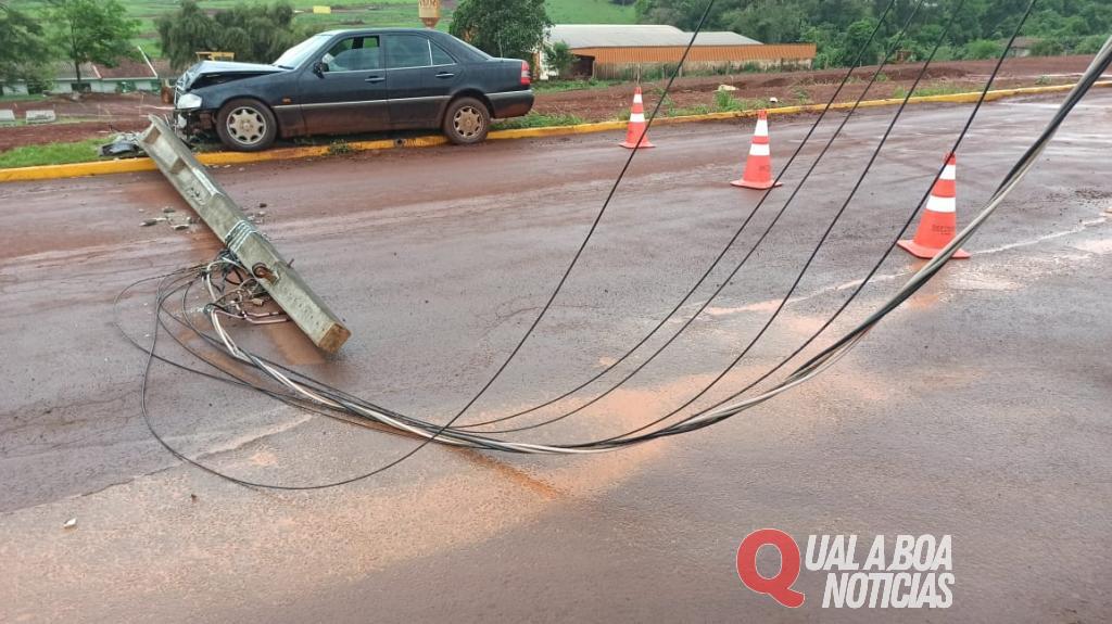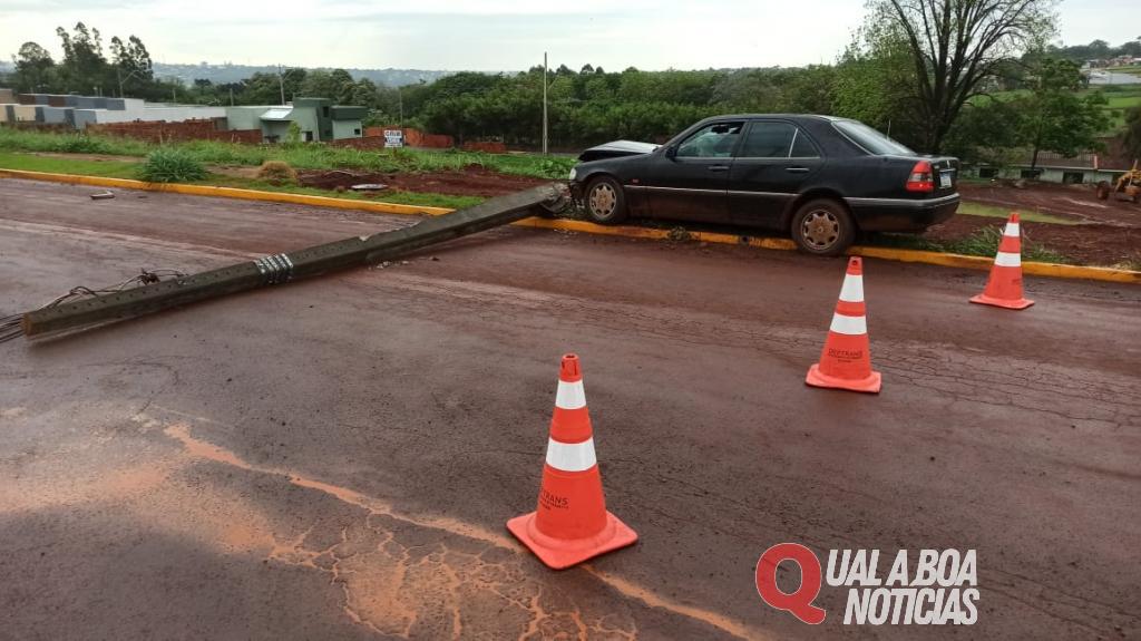 Um veículo Mercedes Benz C280 bateu contra um poste de energia, no bairro Jardim da Mata, em Toledo. O acidente aconteceu hoje (18) rua Navilio Donassolo, quando o condutor do veículo perdeu o controle da direção ao passar sobre o barro que se formou na pista com a chuva.