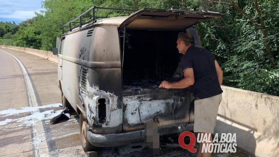 Uma Kombi pegou fogo na tarde desta segunda-feira (25), no quilômetro 174 da BR-163 em Lindoeste, nas proximidades do posto da PRF.