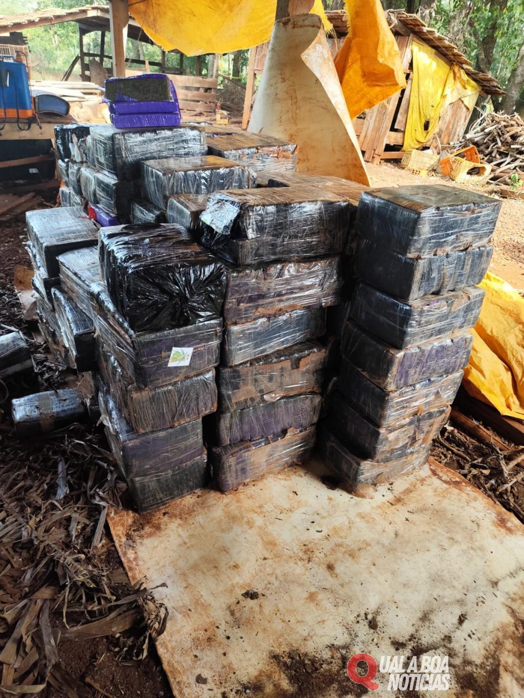 Após informações sobre movimentações suspeitas em uma propriedade rural, as equipes se deslocaram ao local para averiguação. Durante as buscas em um barracão, foram encontrados dois grandes volumes cobertos por lonas. Ao inspecionarem o conteúdo, os policiais constataram que se tratava de fardos de maconha prensada.