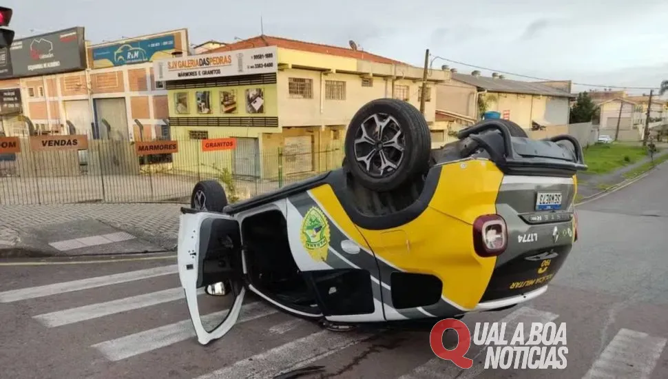 Dois policiais militares ficaram feridos após a viatura onde se encontravam ser atingida na traseira por um Peugeot e capotar na manhã desta sexta-feira (7), em São José dos Pinhais, região metropolitana de Curitiba.